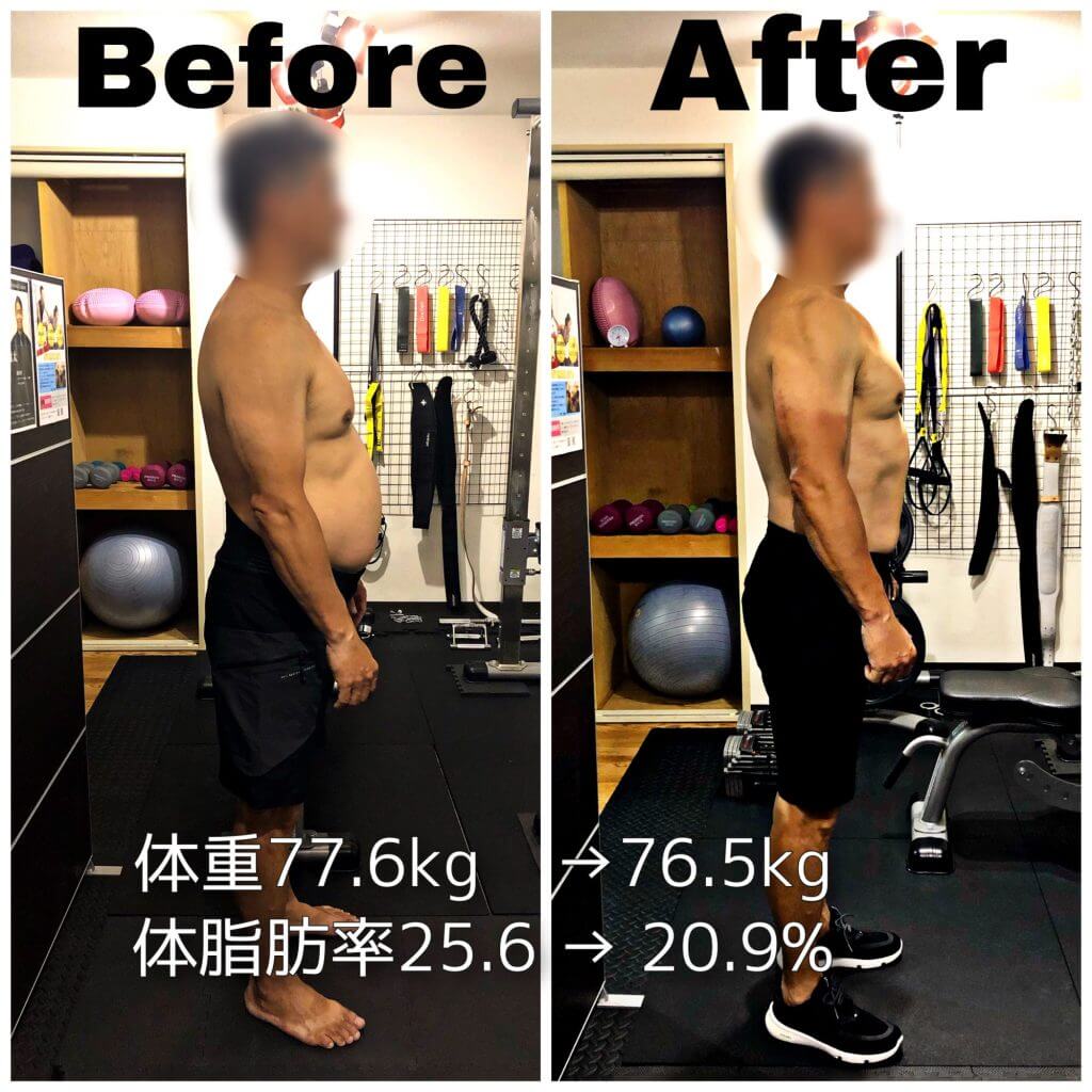 クレアチンをはじめとしたサプリメントの摂取も指導通りしっかり行って頂き、食事やプロテインスムージーなども指導通り忠実に行って頂きしっかりと結果を出すことができました。