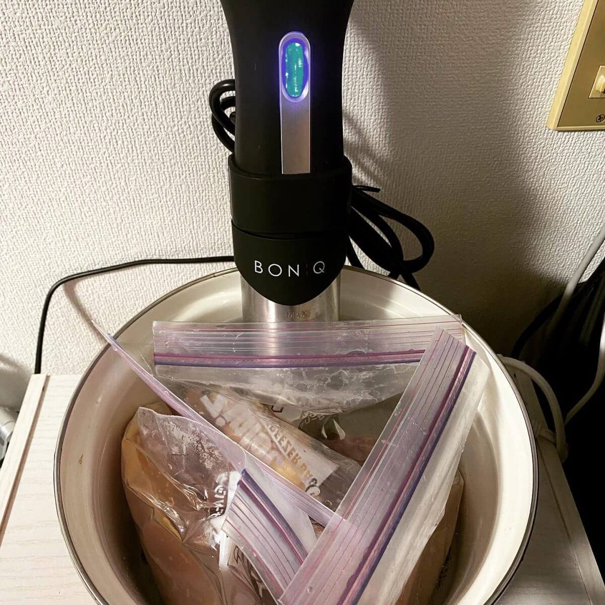 ①鍋に水を張って、BONIQをセットします。(温度は63度、時間は45分)