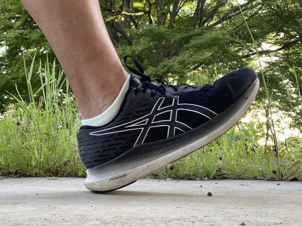 フラット着地では、足の甲が地面と平行になるので、体重を前方に動かすための足の甲の動きが小さくなります。