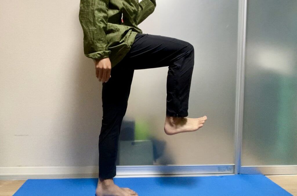 ①片足立ちをして、膝と足首を90度にします