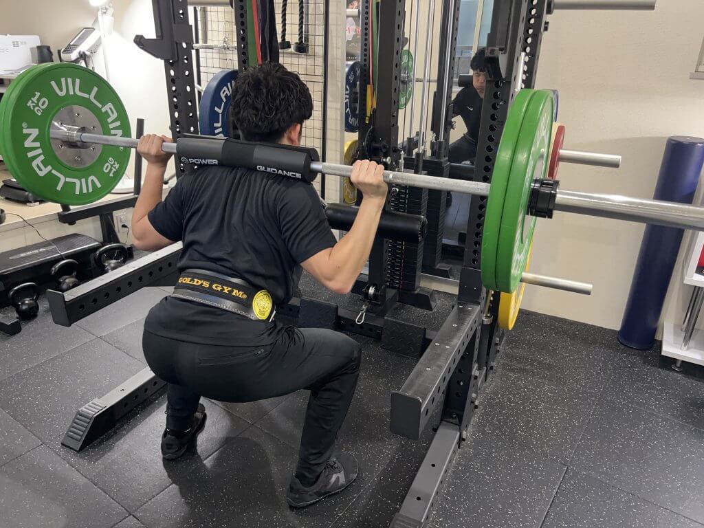 トレーニングのスタートは、バーベルを使ったスクワット(10kg×10回)から始めました。