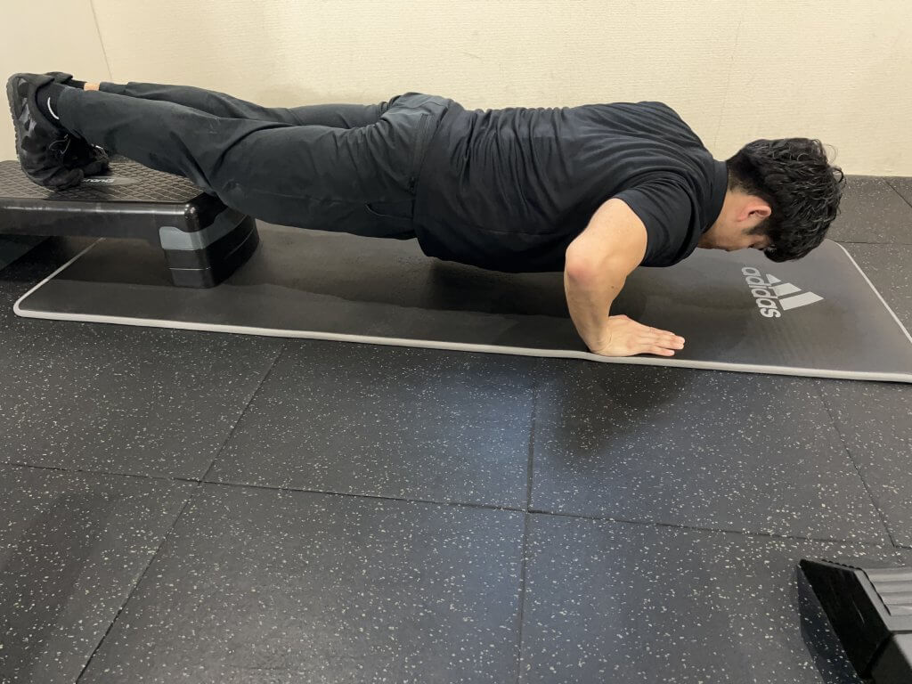 例:プッシュアップ(膝つき)→足を台に乗せて深く沈む