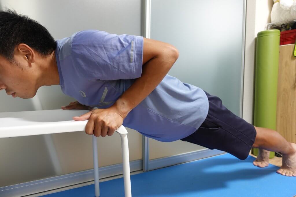 ①少し高さのあるイスに手を置き、足を後ろに伸ばして斜めの体勢をとります