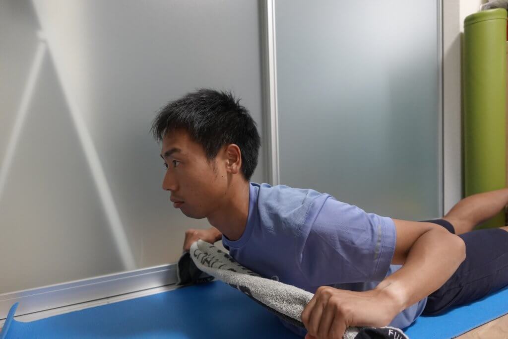 ③上体を反らして胸を浮かせながら、胸の前までタオルを引きます