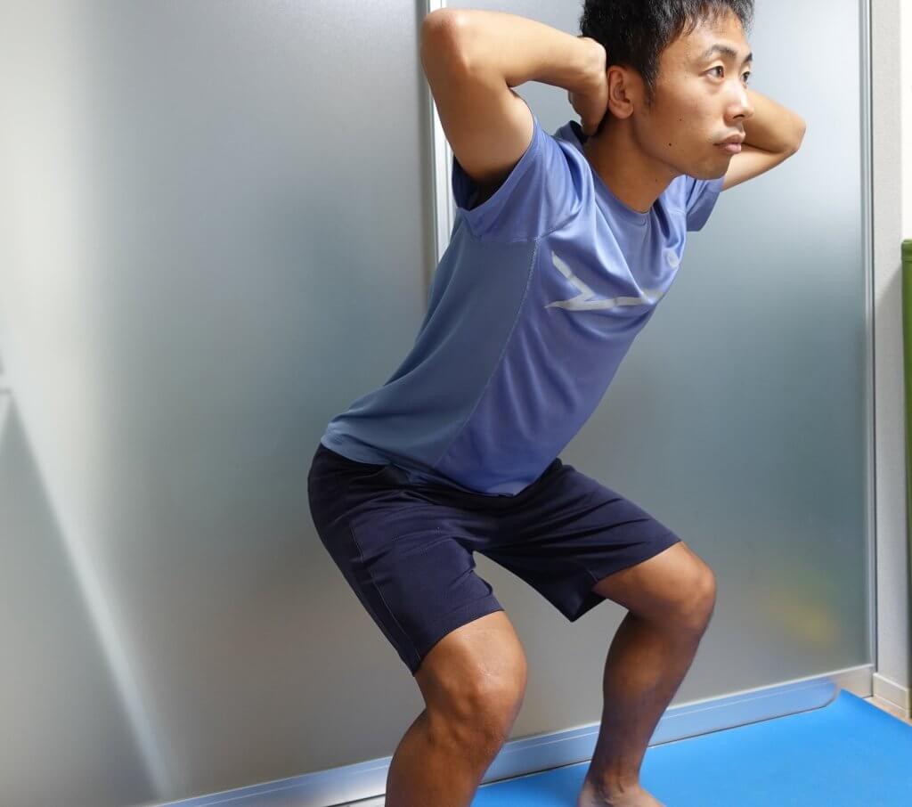②お尻を後ろに引くようにして、膝が90度になるまで下げます