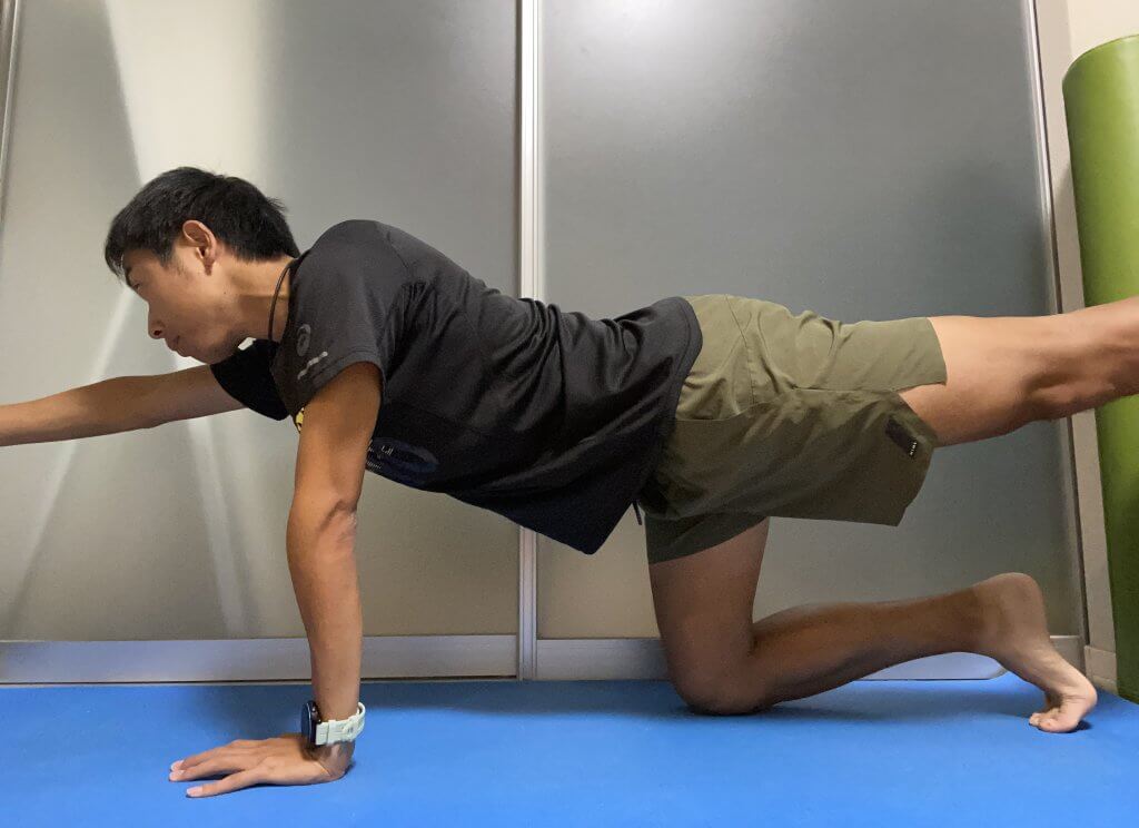 ②片手と反対側の脚をまっすぐに伸ばし、体がぶれないようにキープします